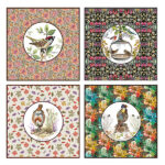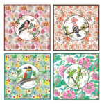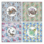 JANUARY features the wonderful Jays with their flash of blue they are nesting and surrounded by an allover pattern of feathers to welcome you into the New Year! FEBRUARY is celebrated by the Wood Pigeons, with their subtle tones of lilac, blue, greys and brown. Perched in a circle they are set on a hand-painted trellis of passion flowers. MARCH starts us off with a watery scence with water fowl enjoying a cold winter morning, all set on a pretty floral. APRIL, we have some yellows, blues and greens florals reflecting the time of year. The central circle has a cute bluetit perching by chrysanthemums. MAY we burst into warmer colours with the red coral chest of the Bullfinch. He loves being surrounded by this soft rose and lace design. JUNE has the extroadinary Hoopoe bird which visits us once a year. He has found a coordinating coral rose design where he feels at home. JULY is the stunning Bee-eater, what fantistic colours his plumage is. He can peer out of his circle at the colourful floral design set on green. AUGUST Has to be hotter and the Parakeets are out in the park in Oxford near me. The background of green leaves and large pink flowers makes a perfect setting for this happy pair. SEPTEMBER the garden birds are feeding on my new birdfeeder, this everyday scene stands out on a stylized leaf and butterfly pattern on black. OCTOBER is Autumn and the colours are reflected in this floral and leaf design. The Chaffinch stands out on his branch, he too has the reds, golds and browns for this time of year. NOVEMBER the leaves have fallen making a beautiful pattern to surround the appearance of the grey partridge a little early for Christmas. DECEMBER, yes, it’s Christmas time! We need some festive colours. The male pheasant does not disappoint with his splendid bright plumage. The same colours are brought into a very festive background pattern of leaves, cones and holly to surround this impressive bird.